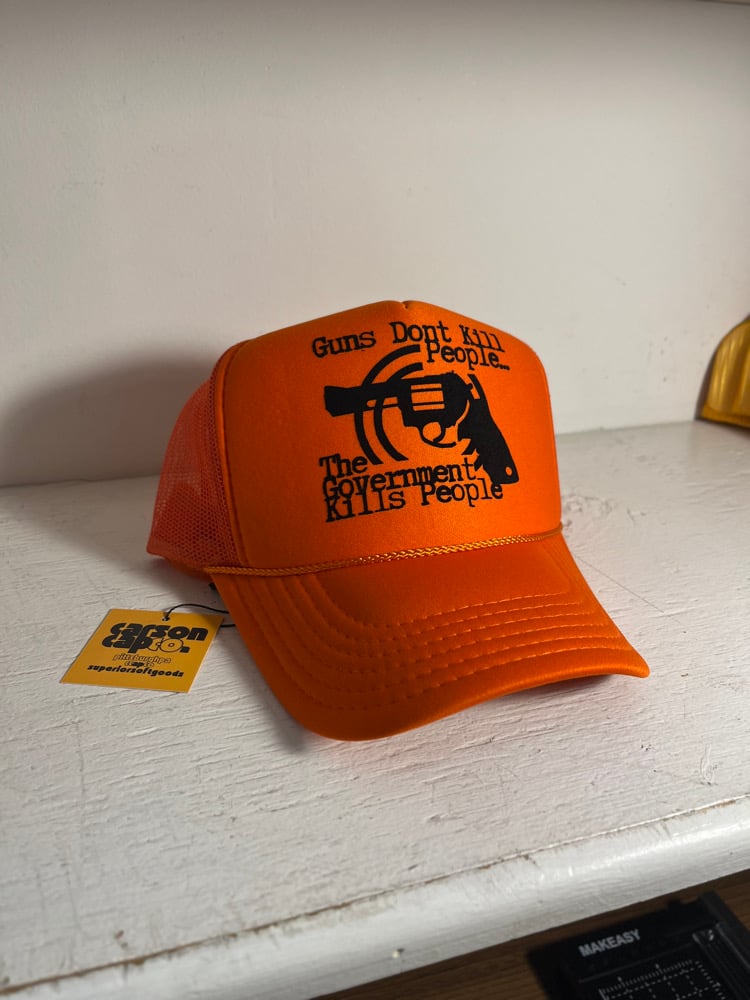 “Guns Dont Kill People… the Government Kills People” in black velvet on orange Otto World Famous Trucker. Yes I just watched Happy Gilmore 2. and Yes I watched a King of the Hill marathon on tv while I was on vacation. e-mail [email protected] for custom colorways, designs, boots.